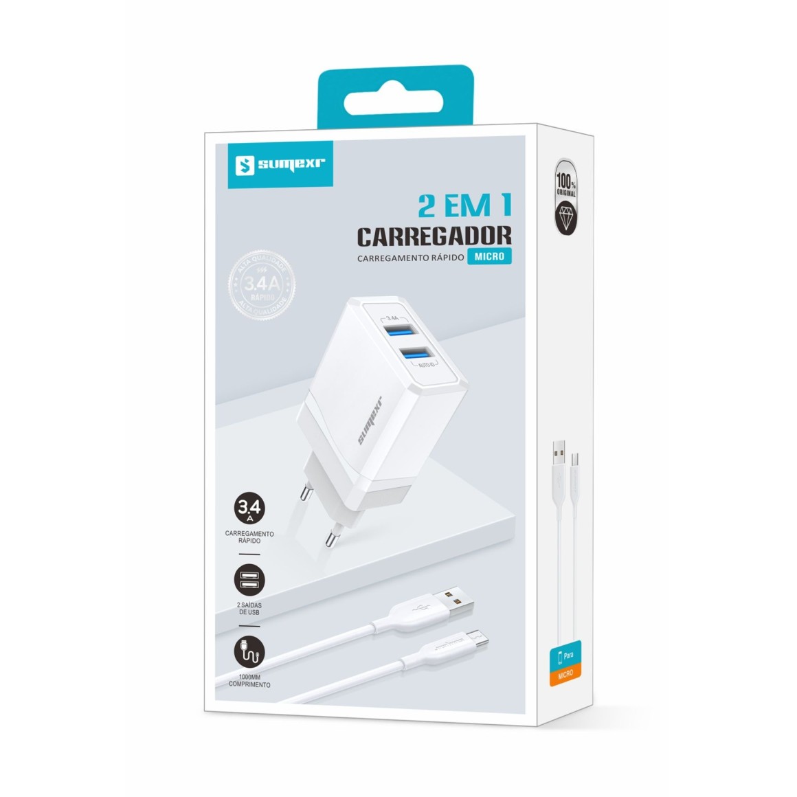 Com um design universal e portátil, este carregador permite carregamento rápido e eficiente em casa, escritório e até mesmos nas suas viagens. Permite carregar dois aparelhos simultaneamente, compativel com qualquer dispositivo com conexão USB. Acompanha um cabo Micro USB.